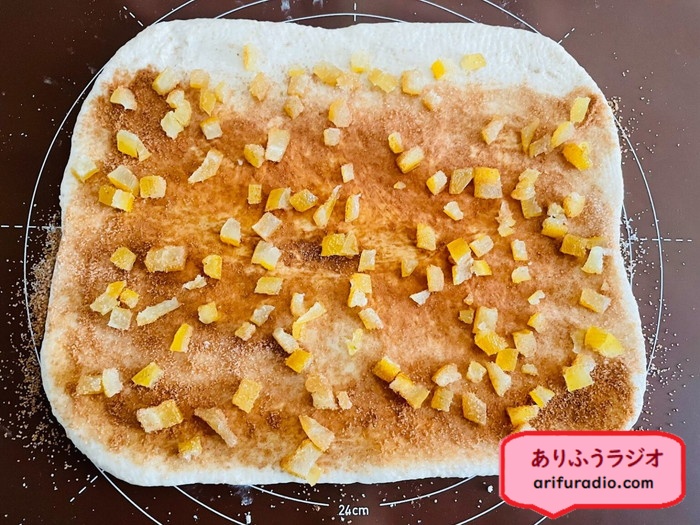 生地を広げ、グラニュー糖とシナモンパウダー、そしてカットした文旦ピールをのせてロールしました。