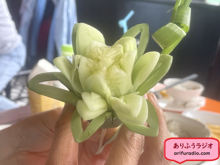 たんなる飾りとして出てきたきゅうりにチーさんはこの飾り切りを手に取って感心することしきりです。