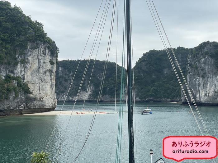 大きな岩を回り込むとビーチと停泊中の他の船が見えてきました。