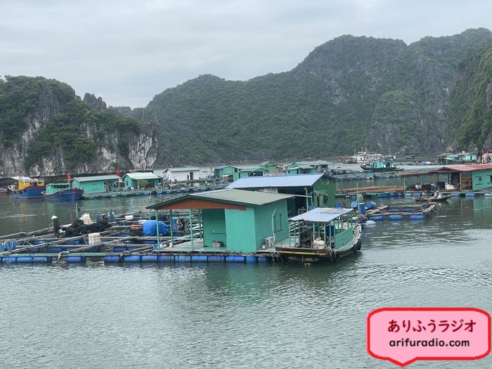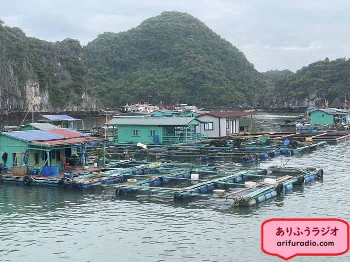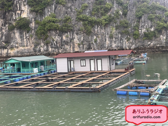養殖用の筏に囲まれて小さな住居があり、それが1つの生活単位のようです。