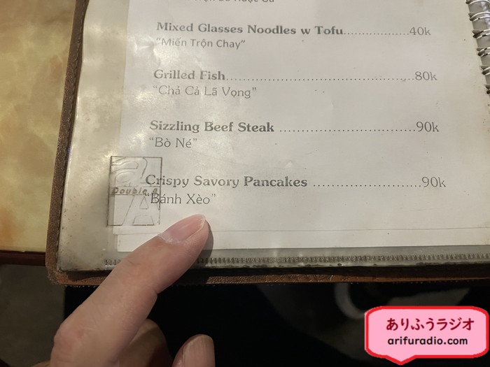このあたりの名物ではないですが、バインセオというお好み焼きのような食べ物を頼みます。90k(約540円)