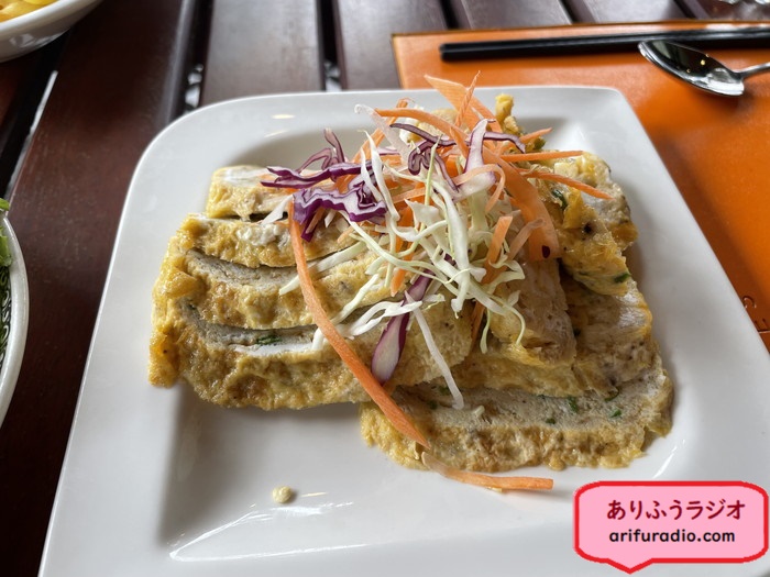 卵料理らしきものが出てきて、チリソースのようなものをお好みで付けて食べます。