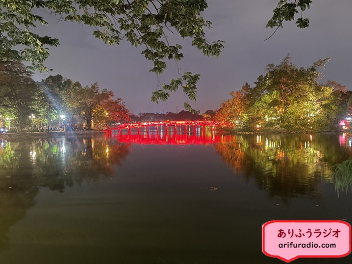 ライトアップされて綺麗な寺院「デン・ゴック・ソン(玉山祠)」に行ってみることにします。