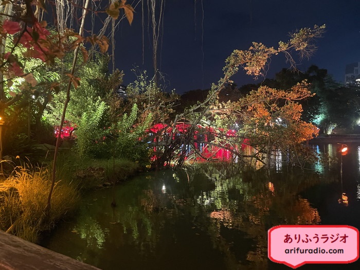 きっと明るい時にきたら大したことはないのでしょうが、ライトアップで照らされた湖や木々がとてもきれいです。