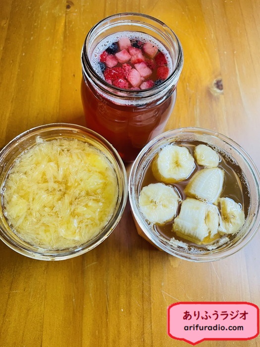 でもここ数日の気温上昇でどんどん発酵が進んだので、さっそくフルーツフレーバーのコンブチャを仕込みました。ミックスベリー、美生柑、バナナです。