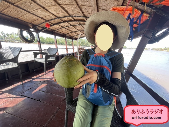 船が動き出したらヴィさんの自己紹介と本日のメニューの説明があり、その後一人一人にまるごとココナッツが配られました。