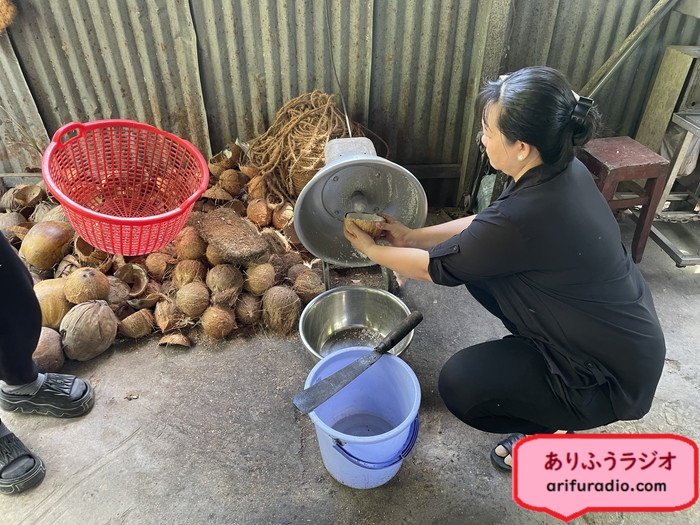 ここでは、ココナッツを鉈でカッチンと真っ二つに割って、中のココナッツ汁をバケツに入れ、実の部分を削り取る工程を見せてくれました。