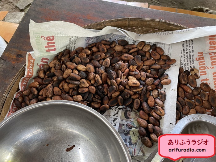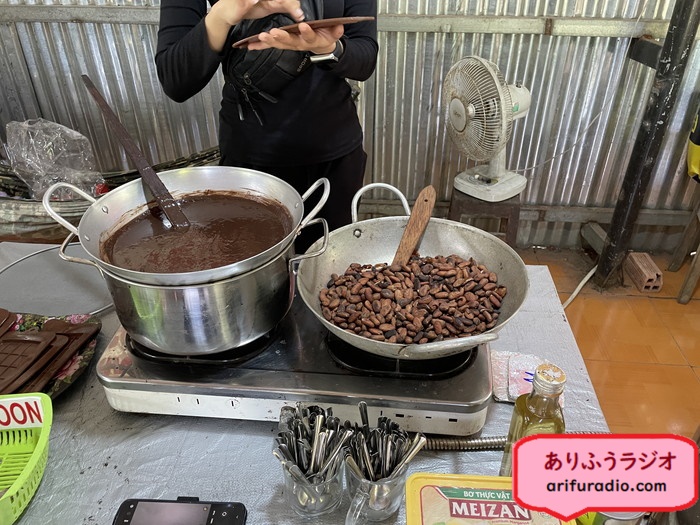 この後、カカオニブをパウダーの粒度まで砕く機械にかけて、できたカカオパウダーにバター、水、を混ぜ1時間弱鍋で煮るとチョコレートになります。