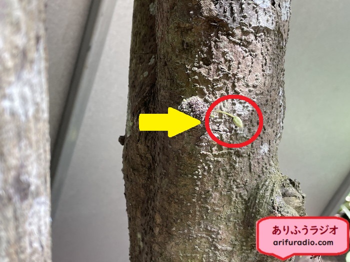 右側の赤丸が見づらいですが、木の実がなっているところです。