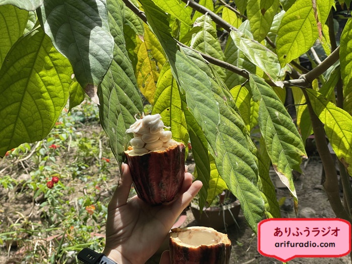 花がいずれ実となり、その実を割ると中からカカオの実が出てきます。