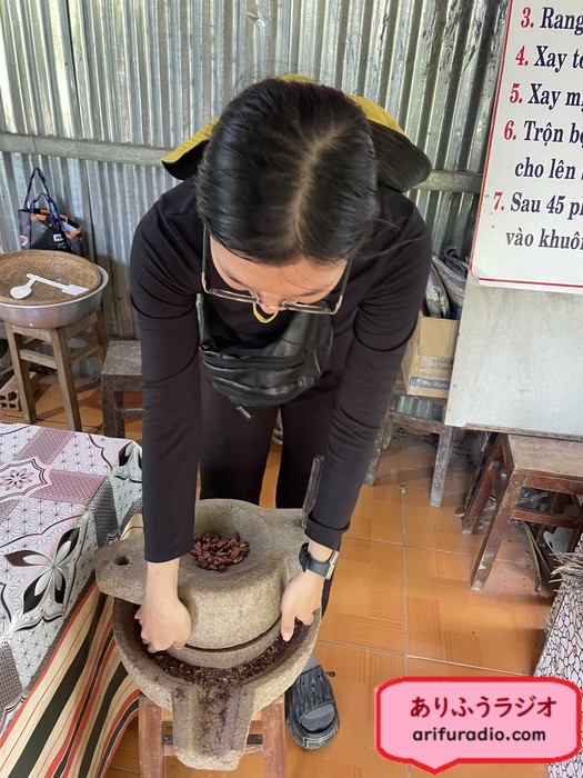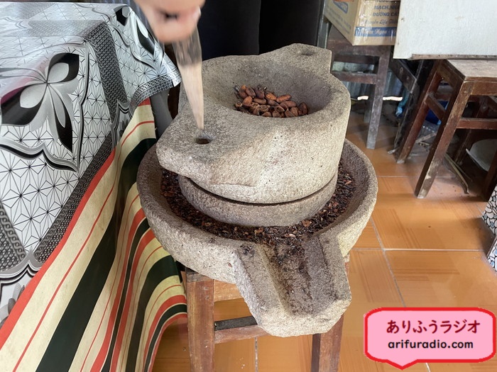 一生懸命、石でカカオを曳いてくれるヴィさんですが、実際のチョコレート工場では、こんなして手で石臼を曳くということは無いそうです。