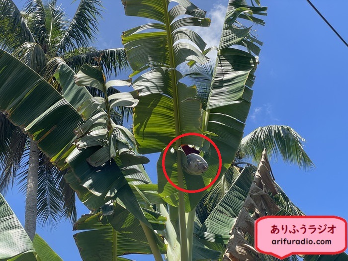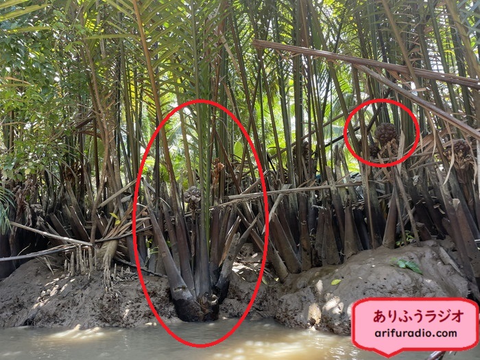 下の写真の大きな赤丸がさっきおじさんにカットして食べさせてもらった水椰子の木です。
