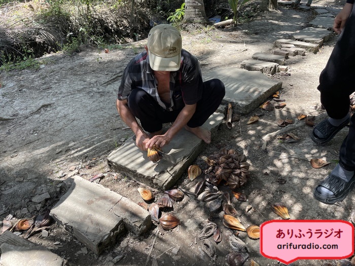 おじさんが上陸すると、おもむろにそこらの木の実を鉈でたたっ切りだしました。