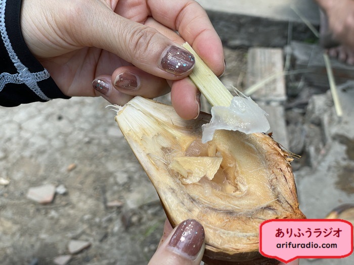 即興でおじさんが作ったつま楊枝でヴィさんが食べ方を教えてくれました。