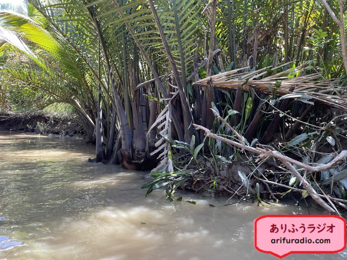 途中、大きな船とすれ違ったり抜かされたりしたけど、その度に水椰子の木陰に入って転覆を逃れていました。