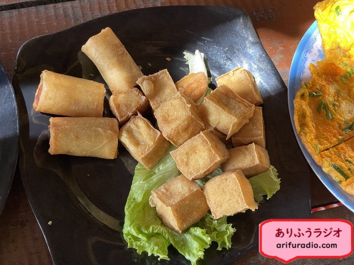 そして、厚揚げのような揚げ物と揚げ春巻きのような揚げ物。