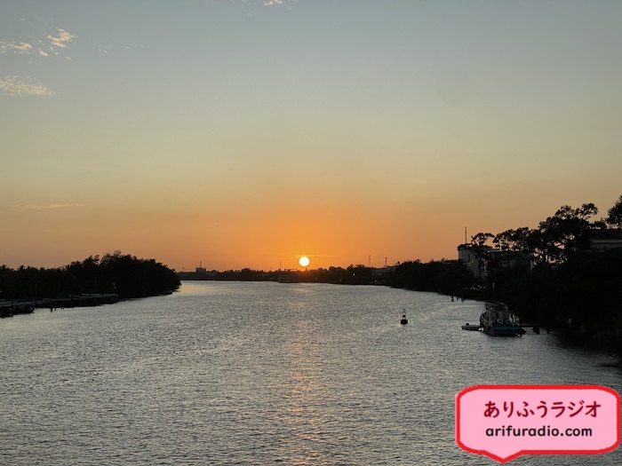 ホテルに戻り一息ついて夕食に出かけるときは太陽が川に落ちるところでした。