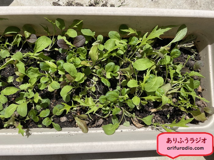 コンポストで作った堆肥にベビーリーフの種を蒔いたのが伸びてきて、何度かサラダにして食べました。