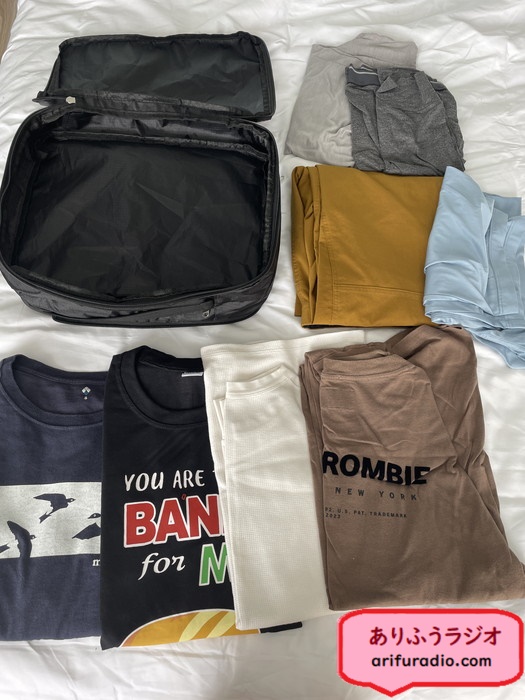 下の写真は私の衣服で、左上の黒い入れ物はダイソーのトラベルバッグです。