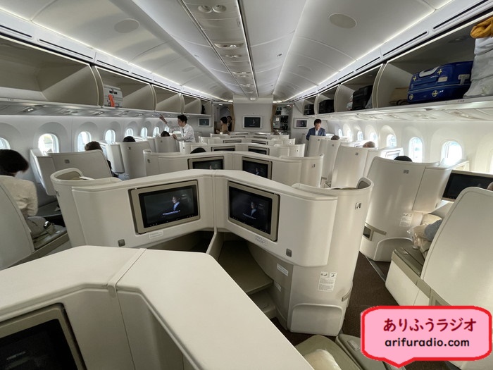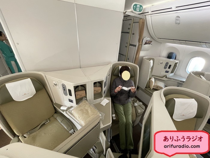 往路便は日中の飛行なので、窓からの眺めも味わいたいところでしたが、座席配置が1-2-1なので、一人が窓際だともう一人は中央になります。