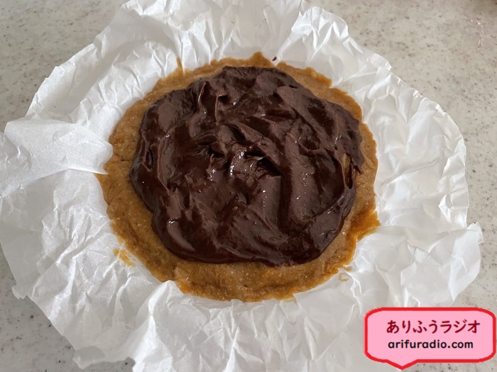 酒粕、オートミール、きな粉をベースにした生地に、自家製のチョコレート麹を塗ったところ⬆️です。この段階では酒粕の香りがプンプンします。