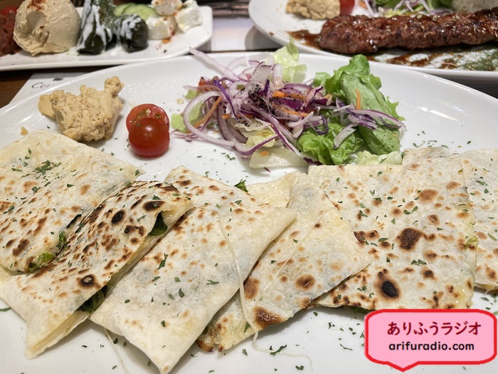でも、チーズは山羊のチーズで少しクセがあります。そのクセのあるチーズとほうれん草が具になっていて、薄いナンかチャパティのような生地のパンで挟んで焼いてあるものです。