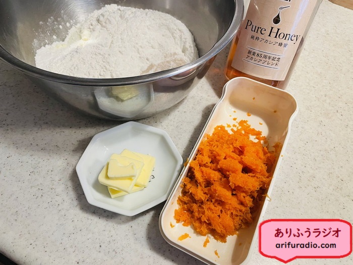 すりおろし人参🥕をたっぷり入れてラウンド型に入れて焼きました。