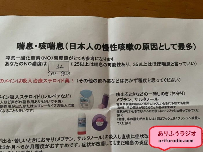 レントゲンは異常無し、呼気NO検査の結果は軽度の喘息でした。