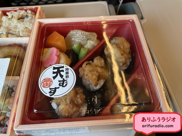 列車に乗り込み、落ち着いたところで先ほどのお弁当を早々と食べるありま夫婦でした(笑)。