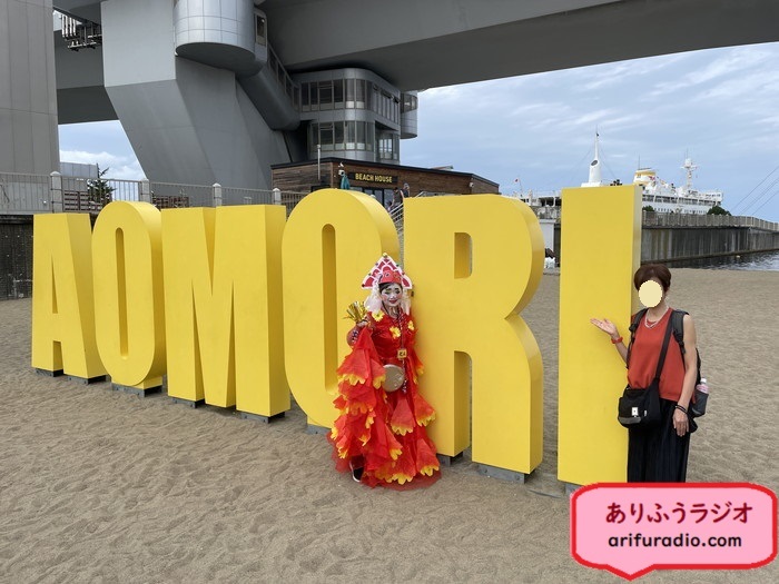 すると、ちょうど「AOMORI」の文字看板があったので、近づくと変な恰好で化粧をした女性が、写真撮りましょうか?と近づいてきました。