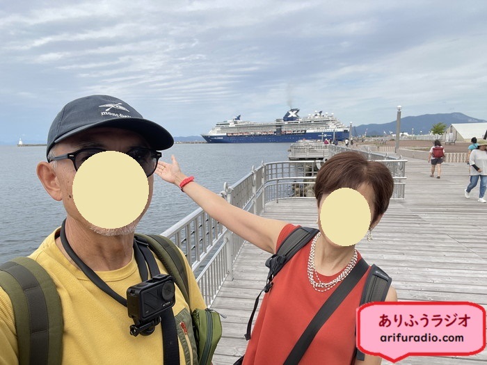 せっかくなので、外国の大型客船を背景に一枚ポーズ。