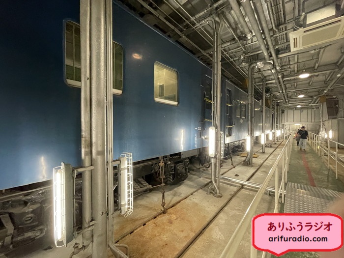 油とホコリクサイ暗い機関室を抜け、車両室に進むと電車がまるまるそのまんま入っていました。