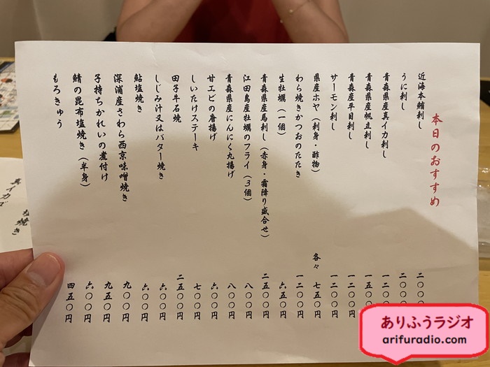 本日のお勧めは「秋刀魚の塩焼き」「嶽きみてんぷら」がいいですね。