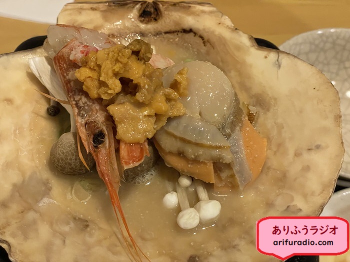 ホテルのクーポンで帆立焼きをサービスしてもらい、お腹一杯地元の美味しいものをいただきました。