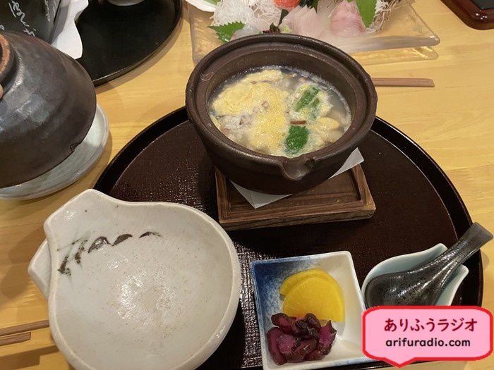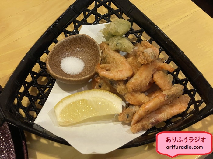 帆立の雑炊、小エビのから揚げなど。