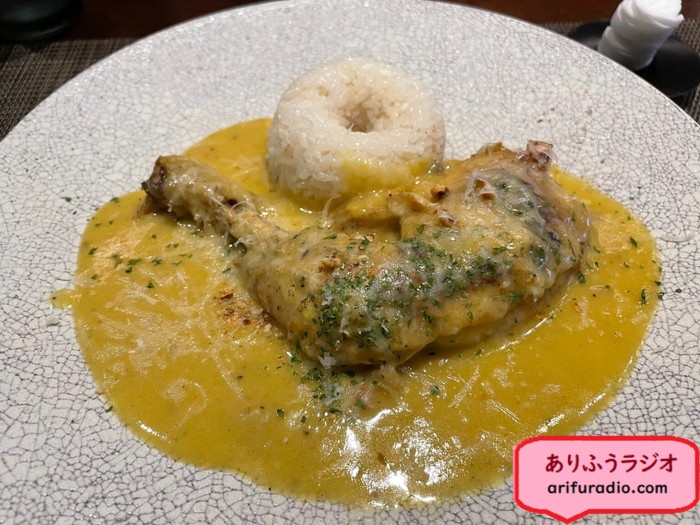 メインは、アヒ・デ・ガジーナ⬆️というペルーの代表的な家庭料理。骨付きチキンのクリームシチューです。ほろほろと柔らかなチキンにチーズベースのソースが絡んで、添えられたガーリックライスにも良く合いました。