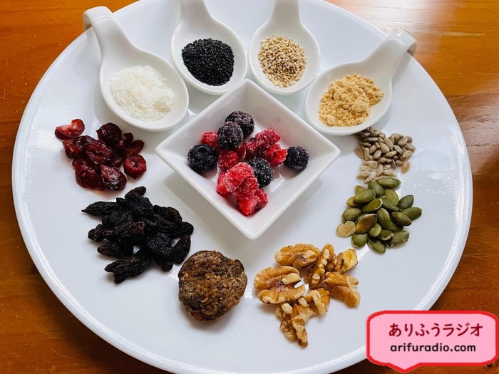 トッピングは、ひまわりの種、かぼちゃの種、クルミ、ドライいちじく、レーズン、クランベリー、冷凍ミックスベリー、ココナッツファイン、バジルシード、白ゴマ、きな粉、ザバス…