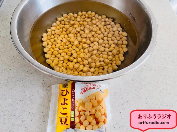 茹でたひよこ豆(私は圧力鍋で3分加圧)の水気を拭き取って使います。