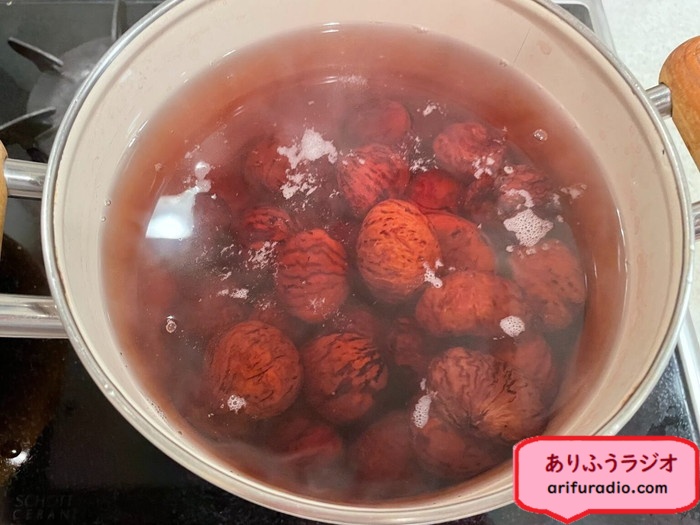 あく抜きが終わったらやっと砂糖を入れて煮込み開始。一日に1時間くらい、弱火でコトコト…これを三日間やりました。