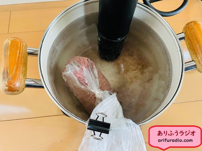 低温調理器の使い方にも慣れてきましたよ。今回は57℃で4時間15分にセット。