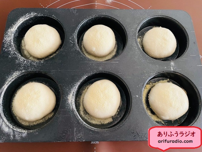 生地にもコーングリッツを混ぜ込み、二次発酵の時に周りにもまぶし、型に蓋をして二次発酵しました。