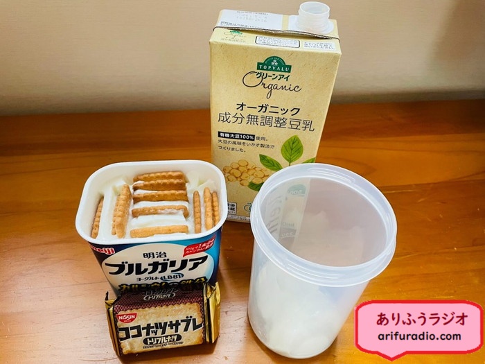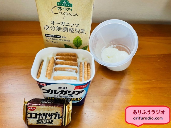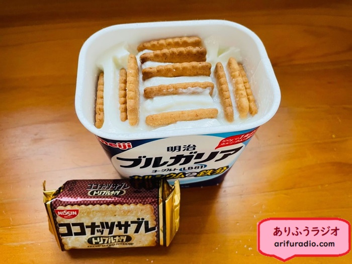 ヨーグルトにココナッツサブレを差し込んで一晩寝かせると、まるでチーズケーキのような味わいになる!というレシピです。