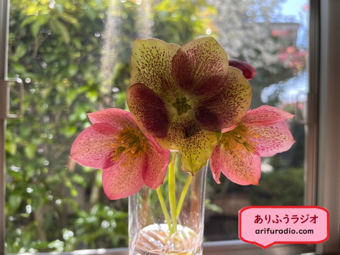 庭に咲いているクリスマスローズ⬆️をカットして部屋に飾ってみました。