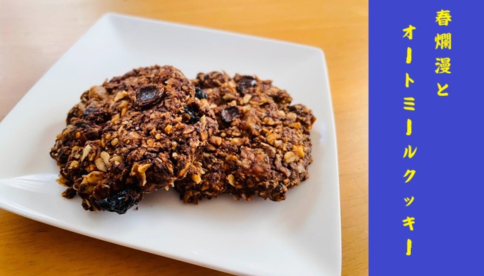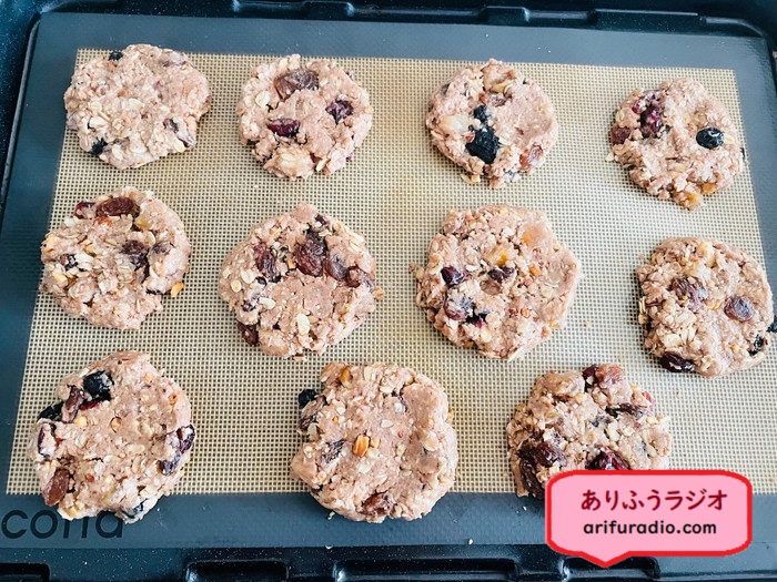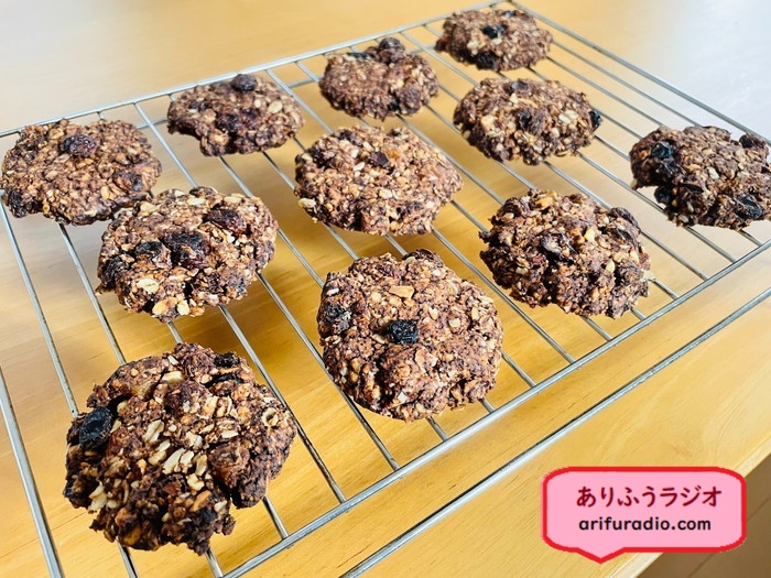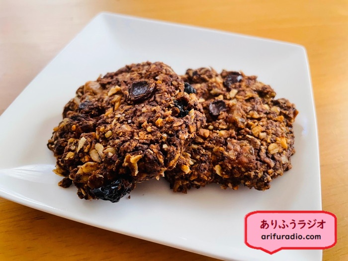 オートミール、米粉、ココア、クルミ、アーモンド、ドライフルーツ、豆乳、米油でクッキーを焼きました。