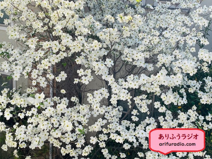 我が家の二階の窓から見た遊歩道のハナミズキ⬆️が満開でとても綺麗です。